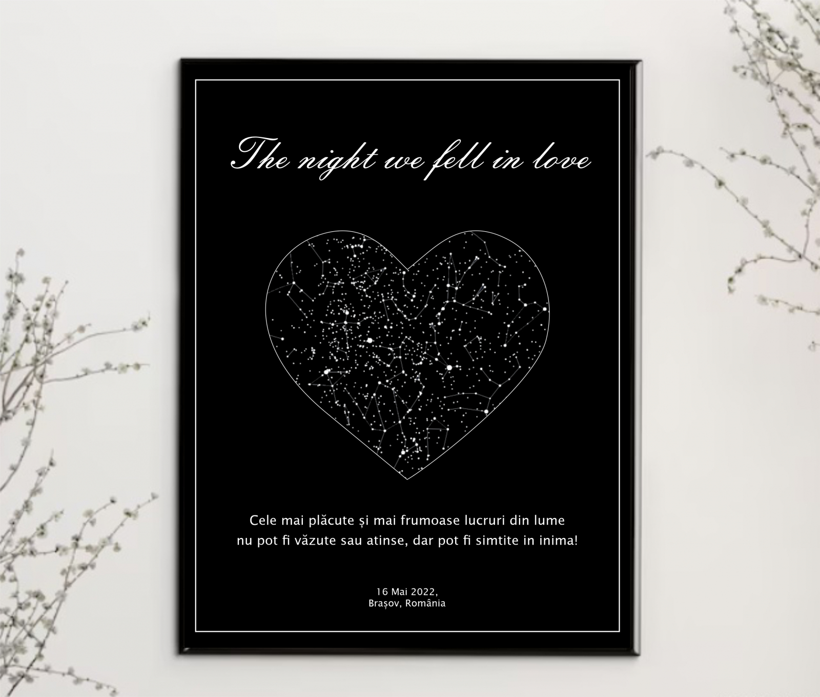 Alege un tablou cu harta stelară personalizată care surprinde cerul în orice dată, oră, locație și îl transformi într-un cadou unic.